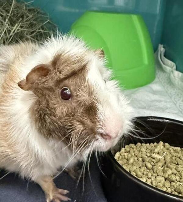 Meet Whopper, a male Abyssinian Guinea Pig with a lovely white and calico coat.