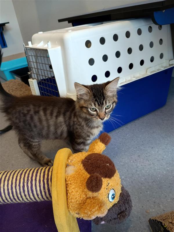 Hi! I'm Bobbin, a kitten who loves to explore and play. Each day is a new adventure, whether I'm chasing shadows or discovering hidden corners. I'm quite brave, always ready to pounce on a mysterious rustling sound. But after playtime, I adore cuddles. If you're looking for a courageous, playful, and sweet companion, I'm your kitten. Adopt me and let's start our adventure together!