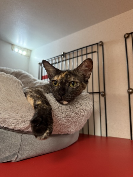 Willow is a stunning Smoke Tortoiseshell cat with a personality as beautiful as her unique coat. She's a gentle and affectionate companion who loves spending time with her favorite people. Whether it's curling up for a cozy nap or enjoying some calm attention, Willow will happily be by your side.