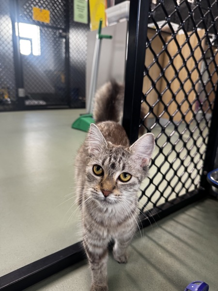 Hazel is an energetic and delightfully crazy 8‑month‑old kitten who is guaranteed to keep life exciting. Full of personality, this curious girl loves nothing more than zooming after her toys, exploring every nook and cranny, and showing off her playful antics. She's the kind of kitten who will have you laughing daily and wondering how so much fun can fit into such a small body.