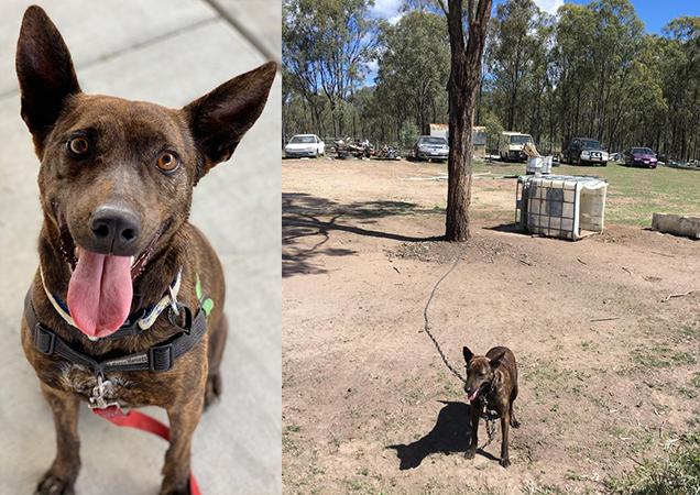 This is Lacey. She had been chained up for eight months and was previously confined to a pen. She had no ability behave like a normal dog. When Inspectors arrived, she was panting in the heat and had an upturned container with no water. The little shelter and shade she had wasn’t sufficient. But, we’re happy to say that Lacey has now gone on to find a loving, new home.