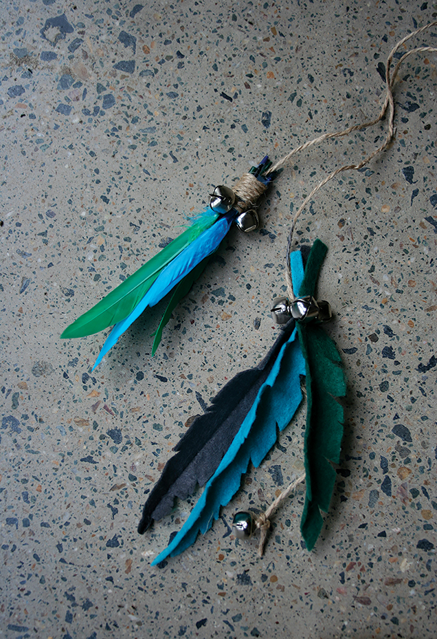 2. Thread two bells onto the end of a long piece of twine and knot the twine tightly around the quills of the bunch of feathers. Cut off the short end of the twine close to the knot.