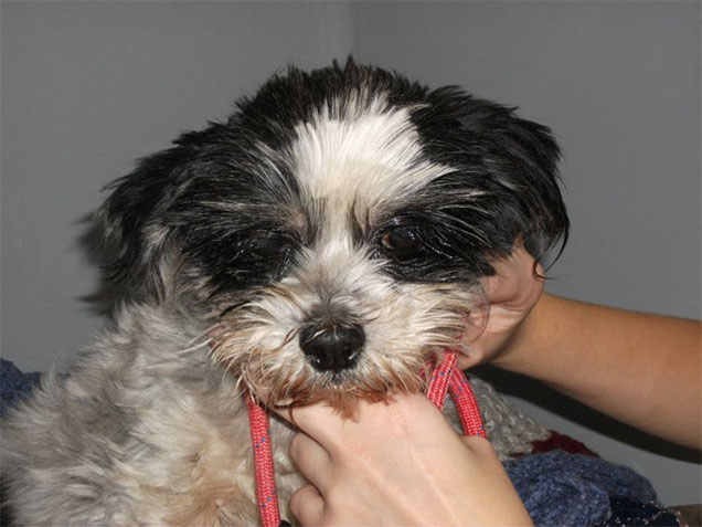 The fur on Rosie's eyes had become tangled and dried up by a thick crusty discharge. The condition causing this extreme discomfort is called Keratoconjunctivitis Sicca (KCS), more commonly known as the Dry Eye Syndrome, KCS is a chronic condition of the eye. It is caused by inadequate tears being available to allow lubrication of the eye which left untreated will damage the cornea of the eye causing pain and eventual loss of vision.