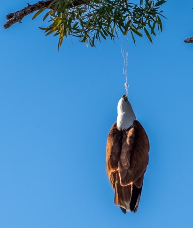 “He was a beautiful bird and this should be a timely reminder to clean up your fishing waste. Sadly we see birds entangled in fishing line on a regular basis. At our Wildlife Hospital in Brisbane a pelican came in that had seven hooks in it and on it!”