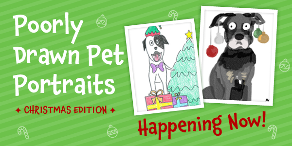 Wednesday 13th AND Thursday 14th December you can have your very own genuine-paw-quality Poorly Drawn Pet Portrait, Christmasified for the Christmas season